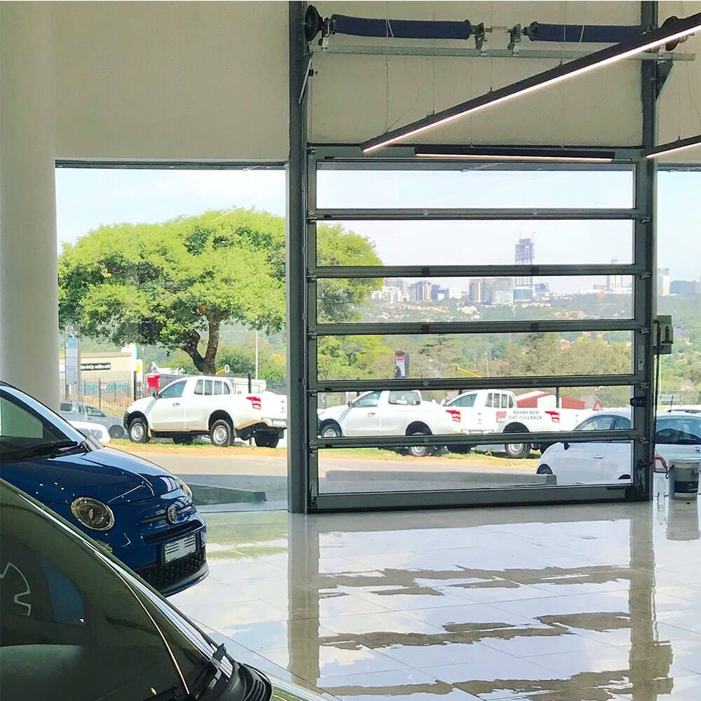 Typical applications are show-rooms, fire stations, or other applications where optimal daylight inlet and/or exposure possibilities are desirable. The aluminium frames of the ASSA ABLOY OH1042FG fully-glazed overhead sectional door are anodized or painted.